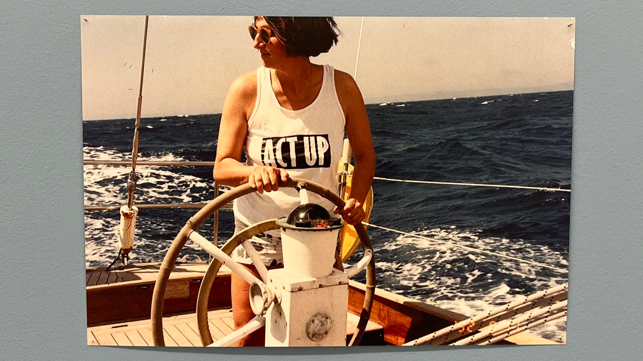 Nathalie Magnan naviguant, portant un top Act Up, lors de l’exposition Magnanrama. Mars 2026, Villa Arson.